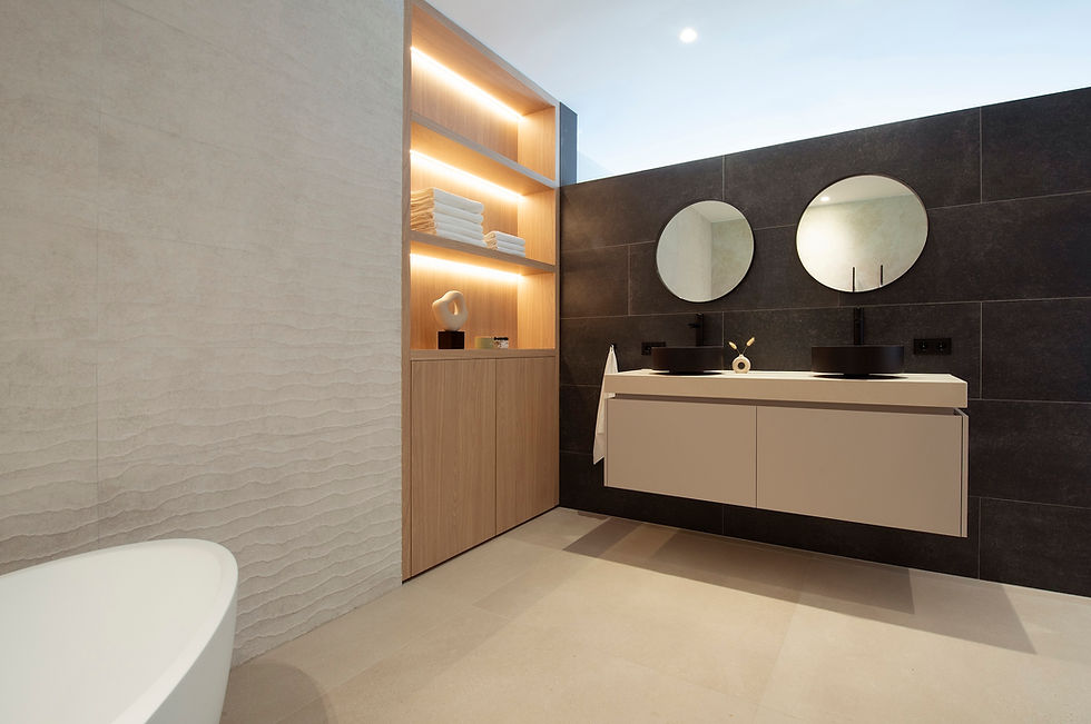 De hoofdbadkamer is een oase van luxe, waar hout, tegels en behang mooi samenkomen. Dubbele douchekoppen en natuurlijke materialen brengen rust en comfort.